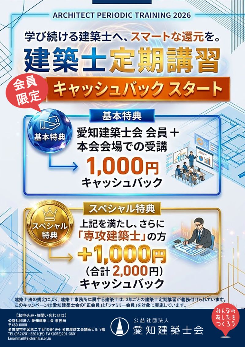 今年度より、(公財)建築技術教育普及センター主催の「令和8年度 一級/二級/木造建築士定期講習」受講者のうち、